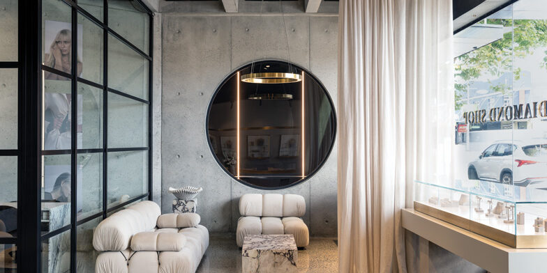 The palette of the fit out is set within the rawness of the structure in precast and in situ concrete, exposed structure, and servicing – raw and elemental. The Diamond Shop injection is comprised of materiality that suggests a lightness and delicacy in contrast. The colours of the base build are black, white and monochromatic concrete contrasting the sparkle of the jewellery. The brass-accented custom display cases and decorative elements within serve to create a liveliness.